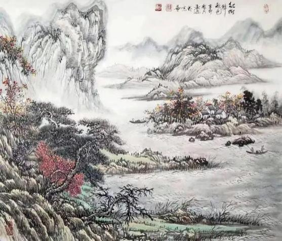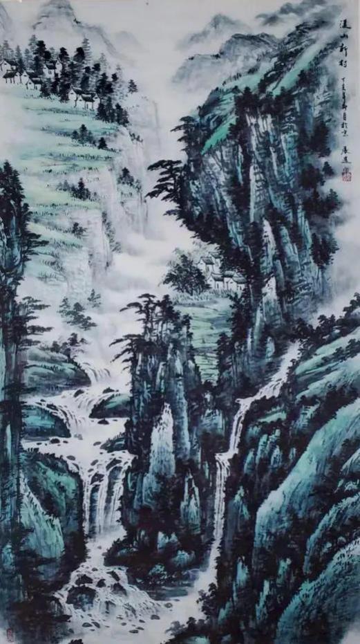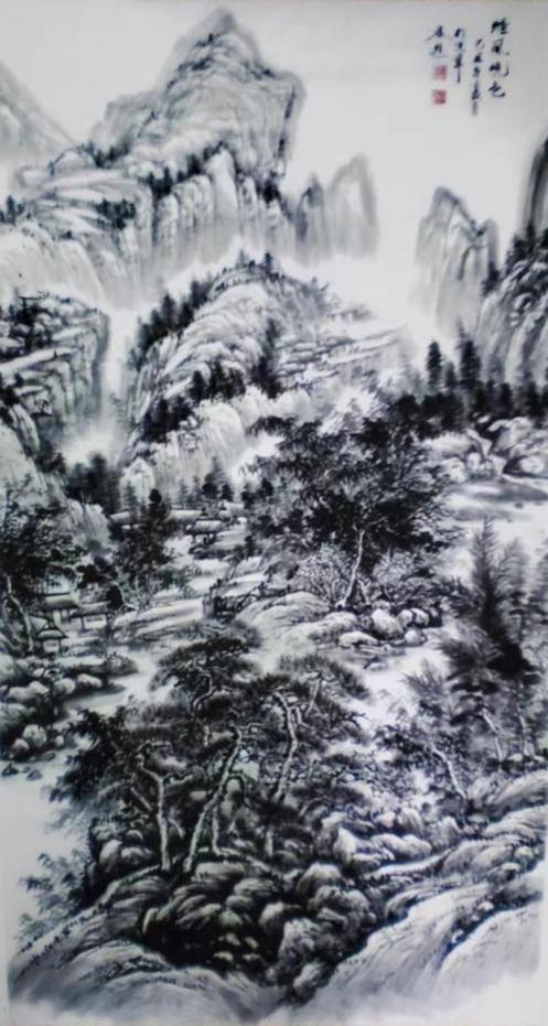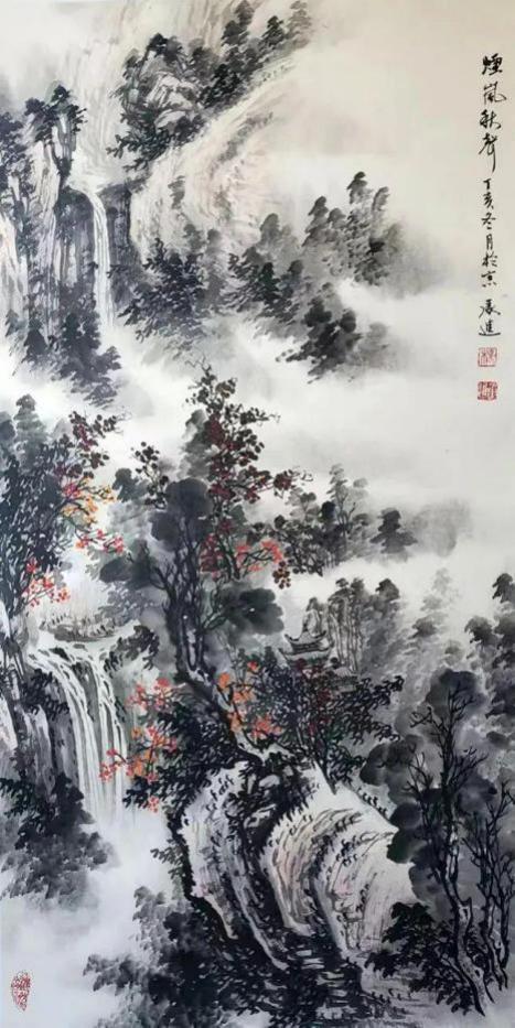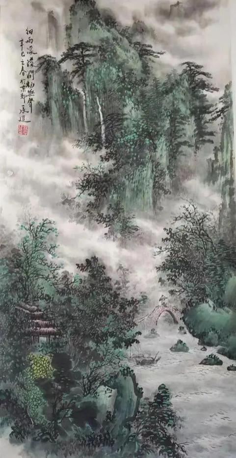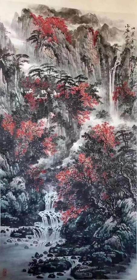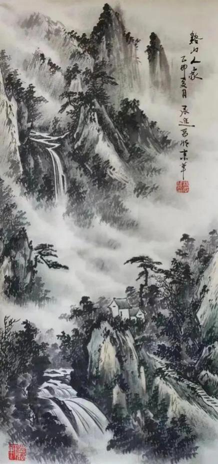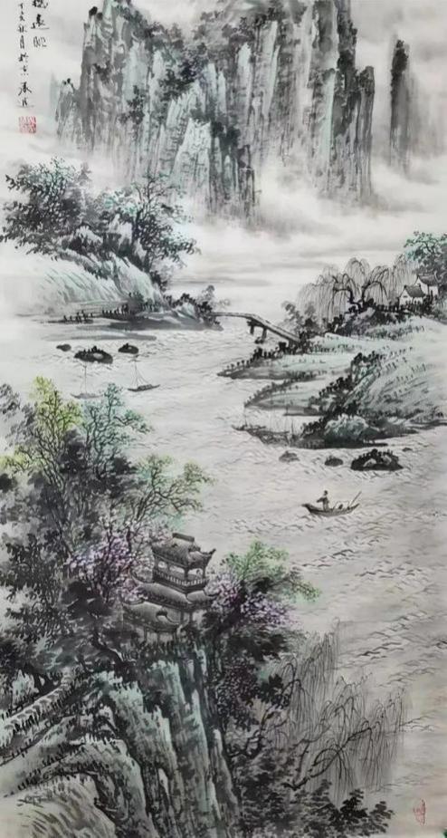 杨承进先生的山,不是秀丽的风景区,而是带有宋人气象的苍茫境域。他善用浑厚的笔墨构建出雄强的山体,层峦叠嶂间,云蒸霞蔚,气象森严。在那一片元气磅礴的天地中,你能感受到自然的永恒与伟力。然而,这片山水并非无人性的荒野。总有一道瀑布垂落,如银河倒泻,为静穆的山林注入生命的律动;总有几间茅亭隐现,或一叶扁舟横斜,暗示着一种“可行、可望、可游、可居”的理想栖居。