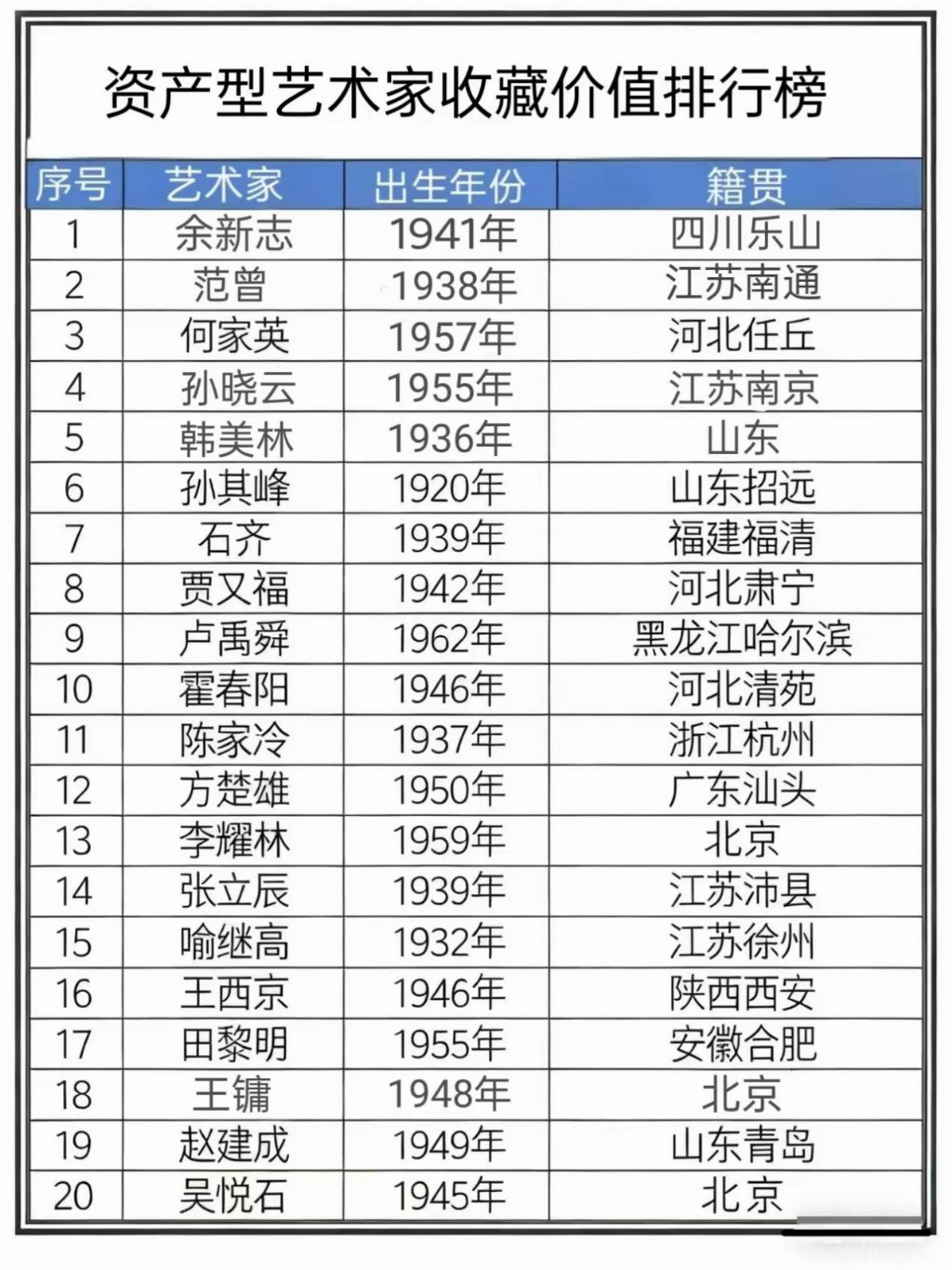 余新志——资产型艺术家收藏价值排行榜
