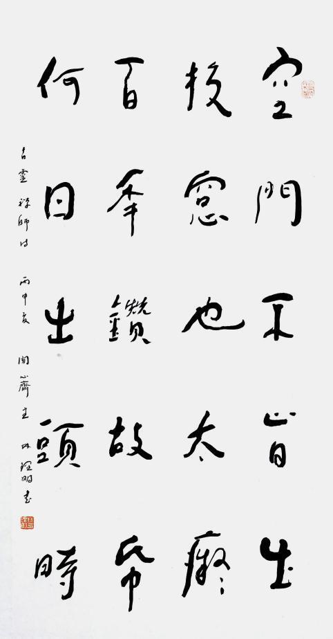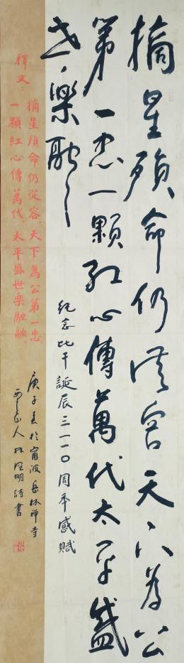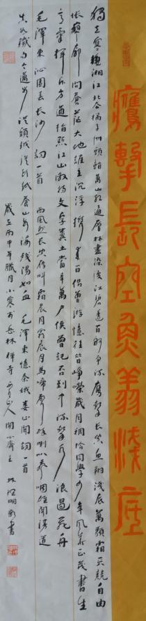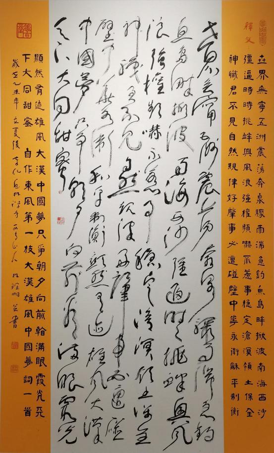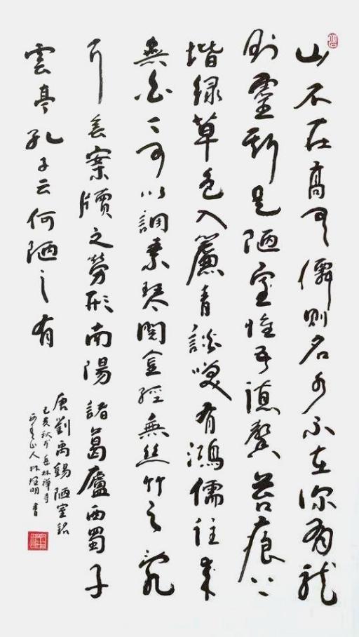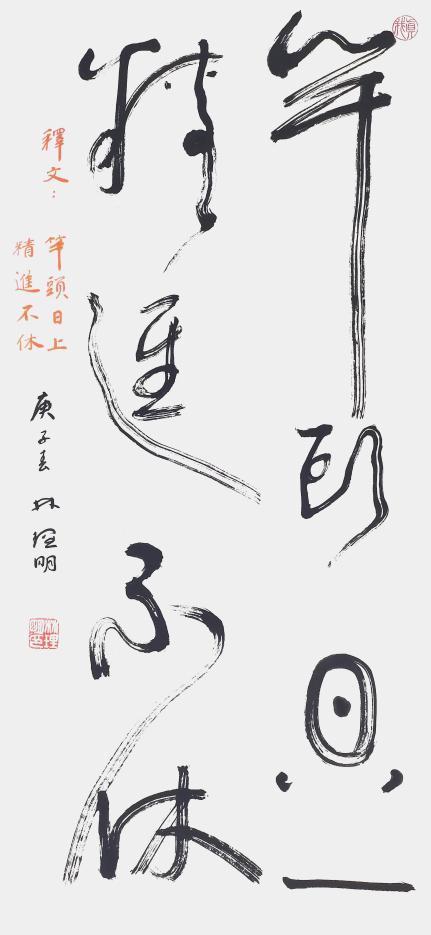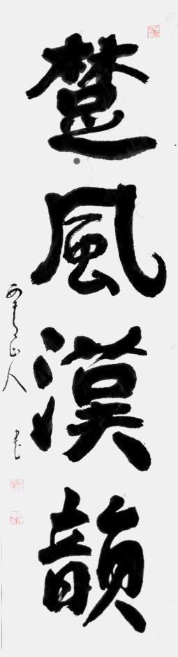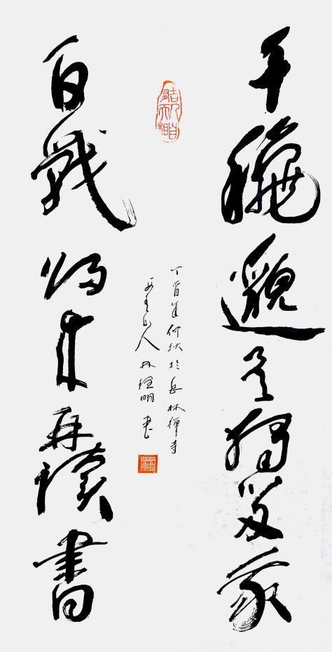 而在一些纯粹的行草书法作品上,林理明先生却又是能极尽于一股纵逸气概!行草取法皆以二王为根基,又有癫张狂素的风范糅合于其中。由此笔墨挥毫之际,时而犹如龙蛇之竞走,时急时缓,妙变见法度,时而又如壮士之拔剑,一气呵成,骨力见洞达。笔线横可似千里阵云,竖可似高峰坠石,撇捺更似崩浪雷奔,提按顿挫,张弛有度,由此纵览之余,皆可谓是以情驱笔,以意驱墨之佳作也!锋毫使转自如,上下牵丝映带,心手相应,疏密相合,复古可观,风采奇绝!