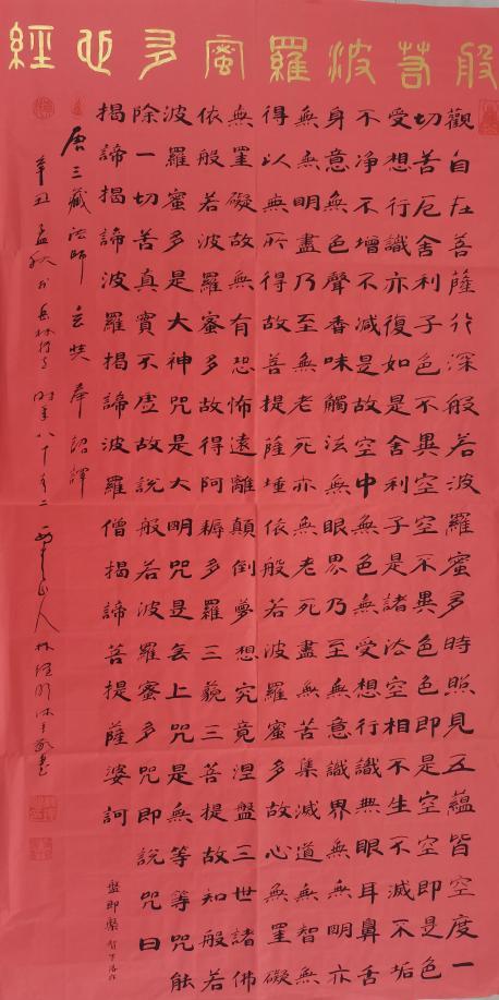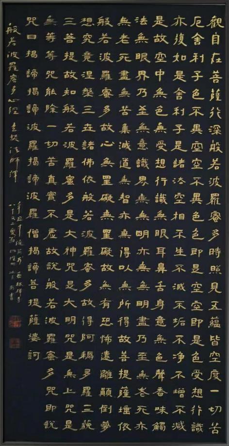 首观林理明先生的一幅经文书法作品,书中字体乃是以隶书为根基,但却有不失于行书余韵,实是以隶而入行书也!而林理明先生之所以能达到这种交融境界,究其原因也是无外乎于两方面,其一即是他对古法碑帖的高度参悟,使之可以得其神骨而勿徒其貌似。另一方面,则就是源自于他那精深至极的笔墨技法和章法布局,此亦是如同明人项穆所言,书之心,主张布算,想象化裁,意在笔端,未形之相也。书之相,旋折进退,威仪神采,笔随意发,既形之心也!如此一来,观其此作,便也就是能在传统隶法的基础上多了一丝直率感和豪宕感,笔意以圆笔使转最具风骨,内蕴正气,外彰和谐,所书字字无不给人一种宽舒之势,通幅排列,则更是犹如楷法一样布阵严谨,遒丽不失稳重,书风不失典雅,古法底蕴,一目了然!